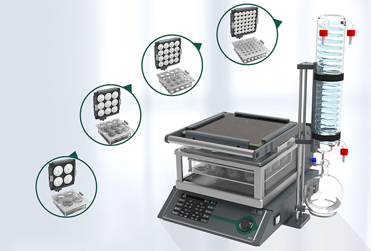 模塊化設計——兼容多種容積樣品瓶 APE 系列真空平行濃縮儀采用模塊化設計,可以選配 850ml、 05450ml、250ml、60ml 樣品瓶適配器,滿足不同體積樣品濃縮需求。
