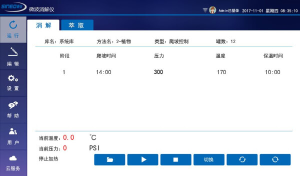 TANK PLUS使用ucos+安卓操作系統 運行穩定可靠,采用7寸液晶彩色觸摸屏,觸控操作流暢簡便。頁面實時顯示工作狀態及溫壓變化曲線。內置專家方法庫,可自行編輯及存儲用戶方法,也可以從云服務方法庫下載其他共享方法。內置COT實時溫壓異常監控系統能夠在任何一個反應罐出現溫壓異常時自動報警并切斷微波從而保護儀器安全。裝有內部攝像頭可實時監控爐腔內消解罐運行情況。